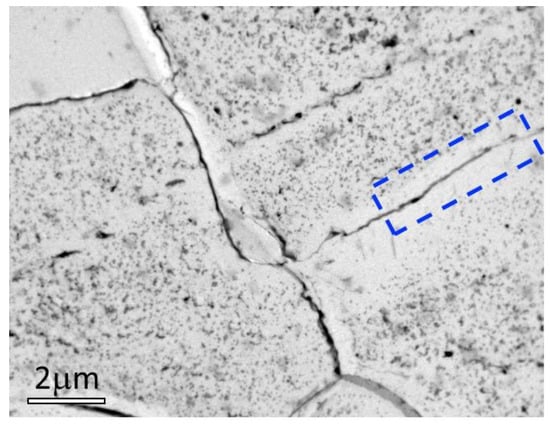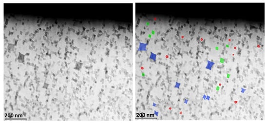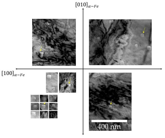 By positioning the directions of ferrite on a brightfield TEM image taken along the zone axis, it was found that all intragranular precipitates with a cuboid shape were systematically oriented with respect to the ferrite matrix (Figure 9) [6]. As it can be seen in Figure 9, the faces of the cuboidal shapes were always parallel to {100} α-Fe planes. Upon closer examination using the scanning transmission electron microscopy (STEM) method (bright field mode), it can be noticed that the shape of the precipitates evolved with their size (Figure 10). At small sizes, the precipitates had a shape that was close to a sphere, and as they grew, they turned into cubes with bulging faces. As they grew even further, the faces became concave, and the corners of the cuboid developed into lobes, resulting in an ear (or octapod)-like morphology.