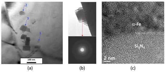 - Van Landeghem, H.P.; Gouné, M.; Epicier, T.; Redjaïmia, A. Unexpected low-temperature crystallization of amorphous silicon nitride into α-Si3N4 in a ferritic Fe–Si matrix. Scr. Mater. 2013, 68, 187–190. [Google Scholar] [CrossRef]