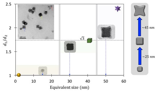 We were particularly interested in the morphological instability sequence. Working exclusively on extractive replicas (see an example in the top left insert of Figure 11), the relationship between equivalent size and morphology was studied for the Fe-1.5wt%Si alloy nitrided for 8 h. Several fields covering about 1.5 µm2 were analysed, and we proceeded step by step. Firstly, the different morphologies observed were classified according to three types: spheroid, cuboid, and octapod-like morphology. Next, the average characteristic size of particles with the same morphology was measured, with the characteristic size being taken as the diameter for spheroids and the corner-to-corner distance for cuboids and octapod-like particles. Although subject to inaccuracies in shape and mean size, this method nevertheless allows a semi-quantitative study to be carried out. The morphological instability of precipitates can be further characterised by the non-dimensional length parameter , yielding the largest length of precipitate along the <111> direction and the smallest length along the <001> direction of the matrix. In the case of spherical particles, , for cubes, , and corresponds to the concave cuboid shape preceding the octapod-like shape of precipitates. This shows that there was a one-to-one link between particle size and particle morphology (Figure 11). For an average characteristic size of less than 25 nm, we found that amorphous Si3N4 particles were spheroid-shaped; for sizes between 25 and 45 nm, they were cuboid-shaped; and for sizes greater than 45 nm, they had an are octapod-like morphology characterised by the formation of lobes at the corners of the particles which can be described as a branching phenomenon (see the sequence shown schematically on the left of Figure 11). It is interesting to note that (i) the cuboid shape observed was characterised by a parameter , which means here that the corners of the cube were smooth; (ii) for , we observed the formation of a concave surface on the (100) faces.