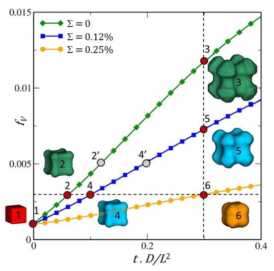 Figure 12 gives the evolution of both the volume fraction and the morphology of a particle β, initially cubic in shape, as a function of the dimensionless time . Firstly, as expected, the growth kinetics was lowered when the misfit between particle and the matrix increased. This was also clearly exhibited on the 3D morphologies obtained at the same dimensionless time for which the volume fraction of β was higher as the misfit decreased (see points 3, 5, and 6 in Figure 12). Secondly, it was clear that the resulting morphology depended on the misfit and therefore on internal stresses. The formation of the octapod-like morphology seemed to be favoured in the absence of internal stresses.