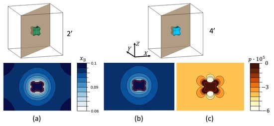 To go further, we considered two different misfit values, and , and a volume fraction of β of (points 2′ and 4′ in Figure 12). The analysis of the composition and stress fields in a (110) plane of the matrix α (Figure 13) showed the following: (i) The composition gradient around the particle was less marked in the presence of internal stresses (comparison between Figure 13a,b). This was perfectly consistent with the fact that internal stresses slowed down the growth kinetics of β. (ii) Both composition and stress fields were anisotropic (see Figure 13b,c). (iii) In both cases, and , we observed the formation of lobes in the corners of the cube, i.e., along the <111> directions of the matrix. The latter was able to appear well before the diffusion fields overlapped (clearly visible in Figure 13a). It was therefore not mainly linked to the interaction between the concentration fields around the particle and the boundaries of the system.