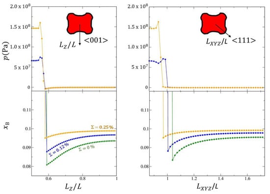 The concentration gradients at the interface were a marker of the interface mobility and therefore of the growth rate of β into α. When there were internal stresses (for and ), particle β was in compression, and matrix α in tension. The greater the misfit, the greater the level of stress in the particle β. We clearly show in Figure 14 that the concentration gradient in the matrix at the interface was steeper in the <111> direction than in the <001> direction. This explains why the corners of the cuboid grew faster than the faces.