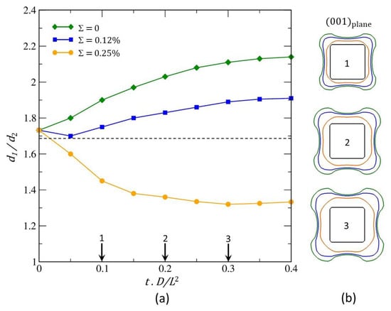 This process had two consequences. Firstly, accelerated growth of the β phase in the <111> directions at the expense of growth in the <001> directions. Secondly, the formation of a concave surface on the faces of the cube. Consequently, the cuboid/octapod-like morphology instability was indeed the result of a kinetic effect induced by the diffusion fields. However, internal stresses played an important role in this instability, and then on morphological evolution. Indeed, we can suspect that the relative growth of β in the <111> and <001> directions depended on the misfit. To confirm this, the evolution of the dimensionless parameter yielding the largest length of precipitate along the <111> direction and the smallest length along the <100> direction was plotted as a function of and dimensionless time (Figure 15a). The morphological evolution in the (001) plane of the matrix was given for three dimensionless times, namely, 0.1, 0.2, and 0.3 (Figure 15b). Remember that and correspond to the spherical and cubic shapes, respectively, with it being clear that the diffusion field alone destabilised the cube to octapod-like shape (the green curve in Figure 15a and green outline in Figure 15b) because the ratio increased as the β particle grew. When the internal stresses increased (i.e., the misfit), we were able to have two different situations. In one, the ratio increased as the particle grew for a misfit of 0.12% (blue curve in Figure 15a). In this case, lobes in the corners of the cube and concavity of the faces of the cube would develop, leading to the formation of an octapod-like morphology (blue outline in Figure 15b). However, this process will be kinetically less pronounced than in the absence of internal stresses. The other was where the ratio decreased as the particle grew for a misfit of 0.25% (yellow curve in Figure 15a). In that case, the octapod-like morphology was no longer observed. The internal stresses tended to stabilise the cuboid or even to destabilise cuboid to spheroid shape (yellow outline in Figure 15b). The origin of such a phenomenon can be explained from the mechano-chemical potential gradient, which tends to cause the B atoms to diffuse from the most stressed areas (i.e., the regions located in the immediate vicinity of the cuboid corners in the matrix; see Figure 13c) towards the least stressed ones (close to the faces (001); see the white zones in Figure 13c). These results were recently confirmed by observations and analysis relating to the morphological transition from cube to petal of the iron-rich particle in the Cu-Fe-Co system formation [15]. Furthermore, it was shown that one of the conditions for branching instability to occur is that elastic driving force should be smaller than the chemical driving to permit growth of the particle corners [42]. This is perfectly consistent with our work.