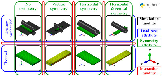The two attributes mentioned, whereby the “load case attribute” can assume two (thermal/thermo-mechanical) and the “symmetry attribute” can take four states (no/vertical/horizontal/horizontal and horizontal symmetry), result in a total variety of eight types of input files, as seen in Figure 1. These eight model variants (from now on referred to as simulation modules), together with the initialization, intermediate control, (re)meshing, rotation, and evaluation routines (from now on referred to as interaction modules), form the different stages of a virtual process route that have been designed for efficient modeling and simulation of the overall heavy plate rolling process.