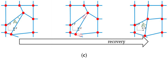 However, this manipulation potentially disrupts the regularity of the elements in the bulk. For this reason, an adjustment mechanism is installed downstream. Degenerate elements are identified and rehabilitated using an angle criterion. Suppose the angle β between two element edges of the examined element is outside the tolerable range of 30° to 150°. In this case, the node located at the vertex is slightly moved to bring the angle back into the fair range. The temperature at such nodes is interpolated accordingly. An abstraction of this procedure is outlined in Figure 3c.