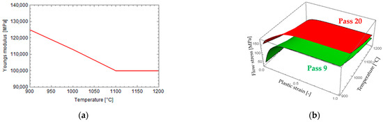 Beyond the yield limit, the material is deforming plastically with 90% of the plastic energy as heat sources. Individual and temperature- and strain-dependent flow stress curves are selected for each pass, based on the mean strain rate in the deformation zone of each individual pass, to approximate the microstructural dynamics during plastification [13,14,15]. As an example, the temperature- and strain-dependent flow curves of passes 9 and 20 are shown in Figure 5b. Due to high rolling temperatures, it can be estimated that the material is fully recrystallized after each pass. Hence, an undeformed initial state is assumed immediately before each pass. If this is not the case, more sophisticated material models are necessary to achieve satisfactory accuracy. The modular model is open to any material model supported by Abaqus/Explicit 2019.