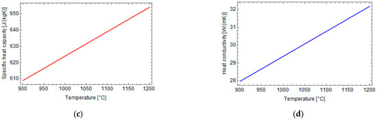 The thermo-physical quantities of specific heat and heat conductivity are assumed to be functions of temperature. As depicted in Figure 5c,d, these two values are linearized within the considered temperature ranges. The mass density is supposed to be constant at 7837 kg/m3.