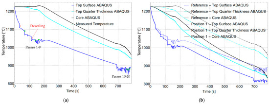 The time course of temperatures at the surface, core, and quarter-thickness positions are shown in Figure 6a. The homogeneous temperature field is disturbed immediately when the slab leaves the furnace due to thermal radiation and convection on the plate’s free surfaces. When the passes are executed (Table 1), abrupt temperature drops are observed on the surface of the plate due to contact with the colder work rolls. This effect is often called the surface chilling effect [25,30]. Judging by the model, the local temperature does not drop to an extent that would impair the mechanical properties of the semi-finished product. However, due to the temperature level and the heat conduction in the plate, reheating occurs immediately. In the process under consideration, the descaling unit is activated twice, once before the first pass and again between the second and third pass. The jets of water, sprayed onto the plate by the descaling unit, also lead to a sudden cooling of the surface, which is again quickly counterbalanced by heat conduction. The water jets, therefore, have no significant influence on the caloric temperature of the plate.