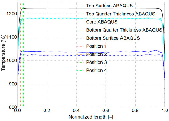 The previous discussion considered the temperature development in conjunction with the plastic deformation and the sole heat transfer from the plate’s upper (and symmetrically arranged lower) free surface. This effect could also be depicted with a 2D model if the consideration is limited to the fillet [31]. However, heat flux on the plate’s side surfaces must be considered to delimit the fillet from the crop in the longitudinal direction. In Figure 6b, the solid lines, therefore, show surface, core, and quarter-thickness temperatures at position 1. Comparing the temperature curves at the reference fillet position (dotted curves in Figure 6b) with that at position 1 (solid line in Figure 6b) illustrates the influence of the side surfaces. A temperature gradient in the longitudinal direction is present here. The surface, quarter-thickness, and core temperatures after the last pass at position 1 are reduced by 77 °C, 104 °C, and 127 °C compared to corresponding temperatures at the reference (fillet) position. Evaluation of the three vertical positions at position 2, shown in Figure 6c, delivers temperature drops of 38 °C, 55 °C, and 67 °C relative to the reference position. Positions 1 and 2 belong to the cut-off scrap [32]. Positions 3 and 4, shown in Figure 6d,e, have temperature differences of 20 °C, 32 °C, and 38 °C and 9 °C, 17 °C, and 22 °C, respectively. This shows that at positions 3 and 4, the influence of the head side surface (Figure 2) has almost subsided since the temperatures reach ≥96% of the corresponding fillet temperatures. In conclusion, forming in the vicinity of positions 3 and 4 proceeds under thermal conditions very close to those prevailing in the fillet.