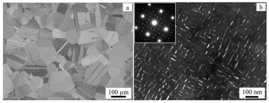 The microstructure of the initial material’s (a) Scanning Electron Microscopy (SEM) image and (b) TEM dark field image, showing γ″ phase precipitates. The insert in (b) is a diffraction pattern in the [100] zone axis.