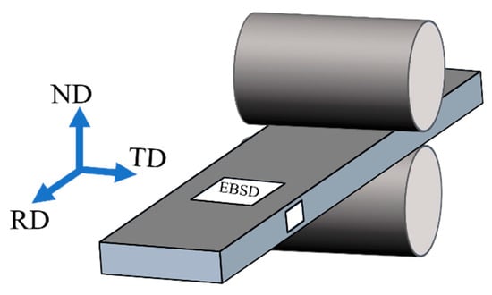 Figure 2 shows the schematic of the specimens’ coordinates, i.e., normal (loading), transverse, and rolling directions denoted as ND, RD, and TD, respectively. The rolling direction was parallel to the longer axis of the specimens. To provide a clear view of the microstructure in three dimensions, EBSD maps on each sample were created from the rolling plane (RD-TD) and from the plane normal to the transverse direction (ND-RD). Large and small area acquisitions were carried out to study the grains’ preferred orientations and grain boundaries. The diffraction data were subjected to grain dilation clean-up by the TSL-OIM program to diminish the noise effect in the orientation maps. The IPF maps of the deformed specimens were noise-removed through one to three iterations of grain dilation with a minimum grain size of 2 pixels and a grain tolerance angle of 5 degrees. The EBSD data were further processed with the ATEX software (version 4.12) (Analysis Tools for Electron and X-ray Diffraction; Beausir and Fundenberger, 2017 []) to determine the texture evolution with respect to the deformation levels through the pole figures and orientation distribution functions (ODFs). The harmonic series method was used for texture calculations. Presuming that the rolled FCC material had orthonormal symmetry, the domain of the Euler space was decreased to 0° < φ1, Φ, φ2 < 90°.