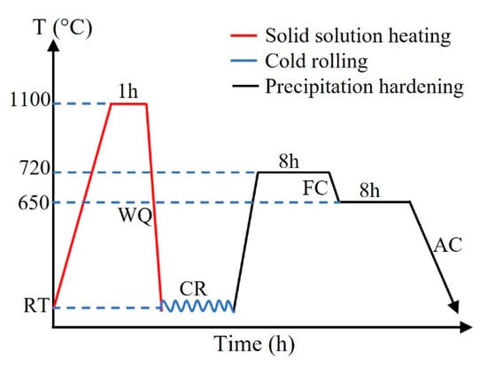 Schematic profile of heat treatment regime and cold rolling, where T ≡ temperature, WQ ≡ water quenching, AC ≡ air cooling, FC ≡ furnace cooling, and CR ≡ cold rolling.