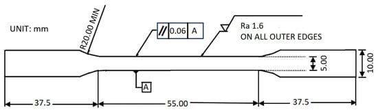 The specimens used in the tensile tests were obtained by machining the bolts (OC) into a rectangular shape with a length of 134–145 mm, a width of 9.5–14.3 mm, and a thickness of 4.7–5.7 mm. The uniaxial tensile tests were conducted at room temperature and parallel to the rolling direction using an Instron 5985 universal testing machine (Norwood, MA, USA) in accordance with test method A1 in ISO standard NS-EN ISO 6892-1:2019 []. The tests were conducted at a strain rate of 0.00025 s−1. The measurement of elongation was carried out with the help of an external clip-on extensometer. The CNC machine used for machining the specimens was the Mazak Vertical Center, Smart 430 A (Florence, SC, USA). The geometry of the specimens tested is depicted in Figure 4. For the 20% and 50% deformed cases, three tensile specimens were prepared. However, due to a shortage of material, only one specimen was available for the undeformed (D0A) case.