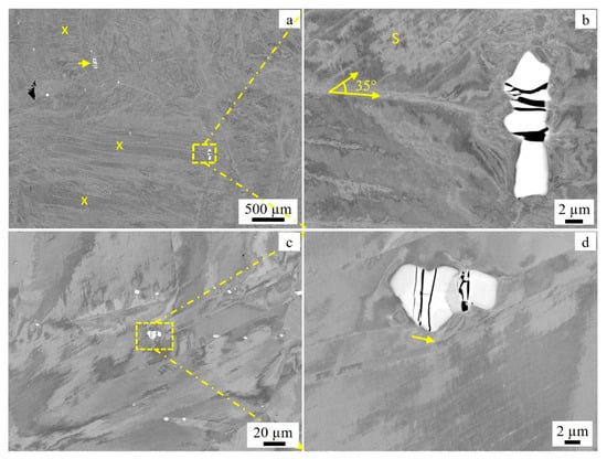 Figure 6 displays the microstructures of plastically deformed D50A and D20A materials. The microstructures marked by the letter X in Figure 6a consist of strips that are parallel to the rolling direction. These strips appear to be elongated grains or twins, but their formation is hindered or blocked by a carbide particle, as indicated by the white contrast. The EDS analysis shows that the carbide particle contains 89 wt.% Nb and 7 wt.% Ti. Due to the forces applied during rolling, the carbide particles are cracked, and the cracks are oriented perpendicular to the rolling direction. The area around the carbide phase is heavily deformed, as shown in Figure 6b. Other particles also exhibit cracks at an angle relative to the rolling direction, as shown in Figure 6c,d. Figure 6d demonstrates how the rolling process dislocated the carbide particle and the strips bent around the bulged part of the particle. The cracks could be reoriented to the shown position after several passes of rolling. Additionally, there are numerous shear bands with a relative orientation of about 35° to the rolling direction (Figure 6b).