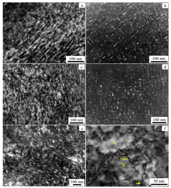 As shown in Figure 7a,b, the precipitates are uniformly distributed in the undeformed specimen. Likewise, the γ″ precipitates in the 20% rolled specimen (Figure 7c,d) appear dense and evenly distributed. However, the precipitates in the 50% rolled specimen (D50A) appear scattered, as shown in Figure 7e,f. The microstructure of D50A contains both high strain and strain-free regions. Examples of strained and precipitate-free regions are marked by X in Figure 7f. The strained region consists of tiny precipitates of γ″ and dislocations that establish high-stress field regions. From these results, we can infer that the hardening precipitates in D50A are more likely to nucleate at highly strained locations than the less strained ones.