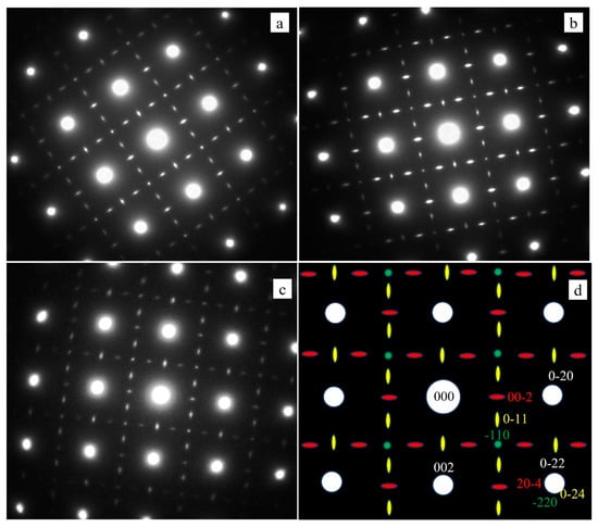 Since the zone axes of γ″ are parallel with the matrix, rows of parallel spots of γ″ are superimposed with that of the matrix, and there exists an orientation relationship between the two phases: (100)γ″//(100)γ; [010]γ″//[010]γ. The simulated SADP of the three variants of the γ″ phase in the [100] zone axis of the matrix is shown in Figure 8d. The white spots correspond to the matrix, whereas green, yellow, and red represent diffraction spots of the γ″ phase variants in the [001], [010], and [100] zone axes, respectively. Some of these diffraction spots are labeled with Miller indices to illustrate the overlapping of the spots (Figure 8d). The streaking of the lattice reflections of γ″ precipitates in the [010] and [100] zone axes indicate that the precipitates are thin and ellipsoidal in shape. The spots in the [001] direction appear as a disc due to the parallel zone axis with the BCT c-axis.
