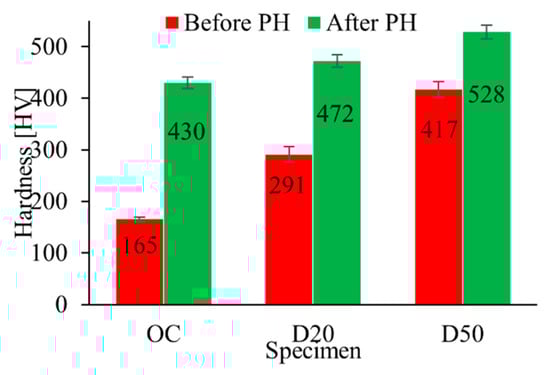 Hardness measurement. D0 represents 0% deformation, while D20 and D50 refer to specimens deformed by 20% and 50% by cold rolling, respectively. Red bars indicate hardness values before aging, while green bars show hardness values after aging. PH stands for precipitation hardening. OC (original condition) is starting material for current investigations.