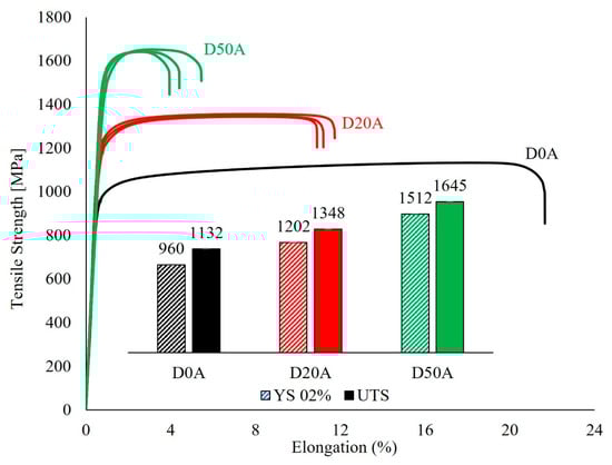 The stress–elongation curves in Figure 10 illustrate the tensile behavior of three sets of specimens (D0A, D20A, and D50A) tested at room temperature. The inset bar chart provides a comparison of the average values for yield strength and ultimate tensile strength. The yield strength is represented by patterned bars and the ultimate tensile strength is shown with solid bars. The colors black, red, and green are used to mark the results related to D0A, D20A, and D50A, respectively. The variations in tensile properties have shown similar trends as those of hardness. The 0.2% yield strength of D20A increased by about 242 MPa (25%), while the 0.2% yield strength of D50A increased by 552 MPa (58%) relative to D0A. Similarly, the UTS of D20A and D50A exceeded the UTS of D0A by 216 MPa (19%) and 513 MPa (45%), respectively. Deformation of 50% resulted in an increment of 310 MPa (28%) in the yield strength and 297 MPa (22%) in the UTS compared to the specimens that were deformed by 20% and aged (D20A). In line with the hardness measurement, the tensile strength also increased proportionally with an increasing percentage of deformation.