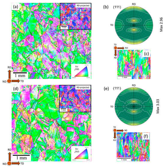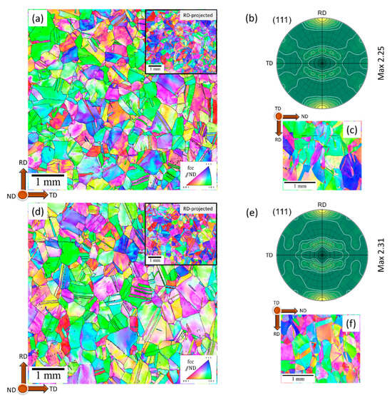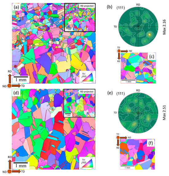Figure 11a,d, Figure 12a,d and Figure 13a,d depict the RD-TD orientation maps of all specimens. To aid in visualizing the orientation, each micrograph includes a small RD-projected IPF in the top right corner. In Figure 11a, a coarse equiaxed γ structure and a significant number of annealing twins randomly distributed can be observed in D0 (undeformed, solution heat treated). Meanwhile, Figure 11d shows the grain structure of the undeformed but aged specimen (D0A). It is worth noting that the maximum intensity of the poles in Figure 11b,e cannot be expanded to whole materials as the number of grains sampled is an important quantity for reliable texture measurements. Additionally, the large grain size may pose a problem in obtaining reproducible results during the statistical measurements used by the EBSD technique.
