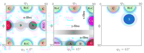 The ideal positions of basic texture components developed for cold-rolled FCC materials are schematically represented in the ODF sections of ϕ2 = 0°, 45°, and 63° in Figure 14 for clarity.