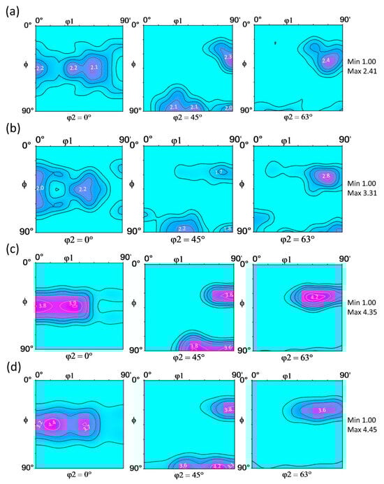 ODF sections of ϕ2 = 0°, 45°, and 63° calculated for (a) D20, (b) D20A, (c) D50, and (d) D50A.