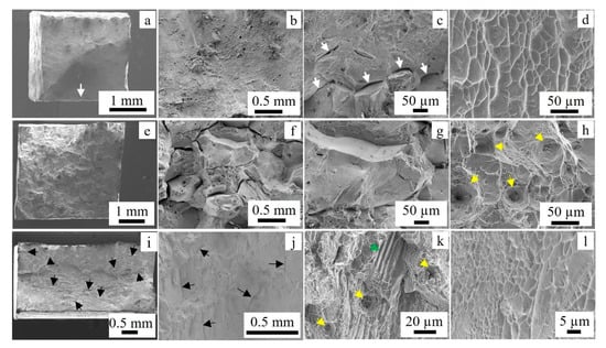 Tensile fracture morphology of (a–d) D0A, (e–h) D20A, and (i–l) D50A. The white arrows in (c) are pointing to microcracks near the edge; the black arrows in (i,j) are pointing to some of the transgranular cracks in D50A; and (h) indicates some of the micropores. Shallow dimples are seen in certain locations of D50 (l). The black arrows are pointing to microcracks, the yellow arrows are pointing to micro voids, the white arrows point to intergranular-type cracks, and the green arrows point to shear-type cracks.