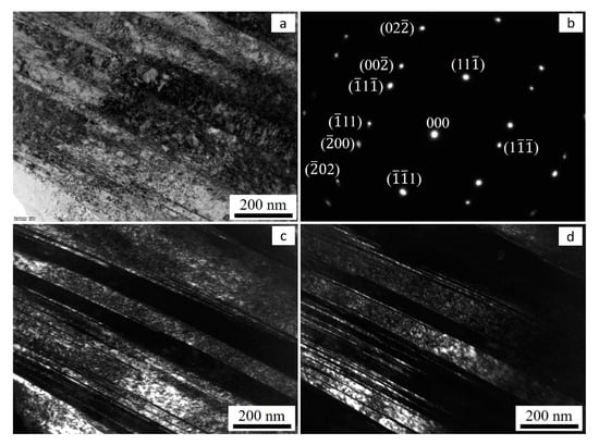 The relationship between tensile properties and deformation can be linked to the degree of changes in the microstructure. To comprehend the mechanism of deformation during cold rolling, TEM analysis can be used. Figure 17 depicts the TEM images of the specimens that were made from the RD-ND surface. The BF (a), DF (c, d), and indexed diffraction pattern (b) exhibit the existence of a high density of twin lamellas ranging from a few nanometers to several micrometers. As illustrated in the images in Figure 17, the twins are stacked together in localized bands that are perpendicular to ND-RD. These nano/microtwins are known to be robust and impenetrable barriers for dislocation slips, as disclosed in the literature []. The small spacing between the twin lamellae significantly reduces the mean free path for dislocation slip. Therefore, the twins enhance the high strain-hardening rates during cold rolling [] in addition to dislocations and other lattice defects.
