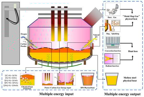 Electric arc furnace (EAF) steelmaking is a significant pathway for steel production and the realization of resource recycling [6,7]. This process achieves rapid and efficient metal smelting, producing high-quality steel and alloys that meet compositional and temperature requirements [8,9]. Short process steelmaking centered around an EAF not only reduces waste in resources but also minimizes the environmental impact. According to the data provided by the World Steel Association, the CO2 emissions per ton of steel from the EAF route, using scrap as the metal charge, are 0.68 tons, with an energy intensity of 10.20 GJ per ton, giving it an advantage over the other process routes [10,11].