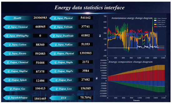 The energy model V1.0 development tool for the EAF steelmaking process adopts Microsoft Visual Studio 2013 and chooses C# as the programming language. The database management system selected is the Microsoft SQL Server 2012 database, facilitating operations such as retrieval, addition, modification, analysis, and integration for users. In this model, the energy input and output are calculated as units of tons of steel, based on the collected material data information and the actual steel production of the EAF. The calculated results are displayed on the interface. After the smelting is completed, the model automatically calculates the EUE with the observations of the energy flow and the utilization by on-site operators. The statistical interface of the energy data is shown in Figure 4. The energy composition and flow of the furnace number ‘20306983’ has an HM ratio of 0.48 and an HM temperature of 1333 °C, as shown in Figure 5.