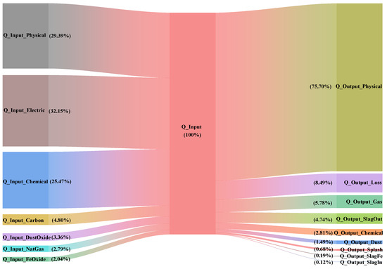 In the steelmaking process of the EAF, the physical heat of the molten steel is the primary form of energy output. Additionally, due to the high temperature of the molten steel, some materials are generated, carrying away a portion of the heat from the furnace. This portion of the energy output is calculated by Equations (11)–(19).
