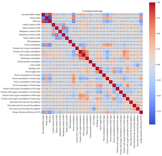 It can be observed that there is a strong linear relationship among some input variables, such as the HM weight, scrap weight, and HM ratio. These variables exhibit significant redundancy in the modeling process, and it is advisable to avoid using all three of them for modeling. However, the preliminary results show weak linear correlations between the 29 input variables and the output variable, because the chemical reactions in steelmaking are very complex, there are many factors that affect the EUE, and there may be nonlinear relationships between the factors. By comparing the Pearson index, we can note that the HM ratio, HM weight, scrap weight, power consumption in the second stage, carbon content in the HM, manganese in the HM, power consumption in the fourth stage, furnace wall oxygen consumption in the second stage, power consumption, phosphorus content in the HM, furnace wall oxygen consumption, time interval for the first lime addition, sulfur content in the HM, power consumption in the first stage, HM temperature, total oxygen consumption, and furnace wall oxygen consumption in the first stage have relatively significant linear associations with the EUE evaluation indicators. The HM ratio and HM weight are the two factors with the highest correlation to the EUE evaluation indicators. The HM weight shows a negative correlation, suggesting that the physical heat brought by the HM is one of the main sources of energy during the steelmaking process in the EAF. It affects the progress of chemical reactions and the amount of the power supply. A higher HM weight or temperature facilitates the progress of reactions but leads to a localized oxidation and the loss of iron. The scrap weight shows a positive correlation with the EUE evaluation indicators, indicating that when the scrap weight is larger, the energy in the EAF is mainly provided by electricity, resulting in less heat loss from splash, dust, and gas, thus achieving a higher EUE. Power consumption at each stage reflects the supply of electrical energy during different stages of the smelting process. Ensuring the adequate supply of electrical energy within a certain smelting time is an important measure to guarantee a smooth operation and improve the EUE. The power consumption in the second stage, power consumption in the fourth stage, and total power consumption are the factors with a significant impact on the EUE. The power consumption in the fourth stage shows a negative correlation and power consumption in the second stage shows a positive correlation. Oxygen reacts with various elements in the smelting process, so that the elements are oxidized and enter the slag or gas, which affects the EUE. It can be seen from Figure 6 that the furnace wall oxygen consumption in the second stage and the furnace wall oxygen consumption show a positive correlation with the EUE, but the correlation coefficients are relatively low. Additionally, strengthening the furnace wall oxygen consumption in the fourth stage is not conducive to improving the EUE. The carbon powder weight and natural gas consumption show negative correlations with the EUE.