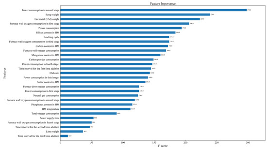 Furthermore, this research also employs the Shapley values to evaluate the importance of 29 input variables by building an XGBoost algorithm model. The SHAP method calculates the average Shapley values for these 29 input variables, and Figure 7 presents the ranking result of their importance. The importance ranking of these variables roughly aligns with the importance ranking in the heat map. The result is shown in Figure 7. After comparison, 10 important data features are finally selected, including the HM ratio, HM temperature, total power consumption, power consumption in the second stage, power consumption in the fourth stage, furnace wall oxygen consumption, furnace wall oxygen consumption in the first stage, furnace wall oxygen consumption in the second stage, carbon powder weight, and natural gas consumption.