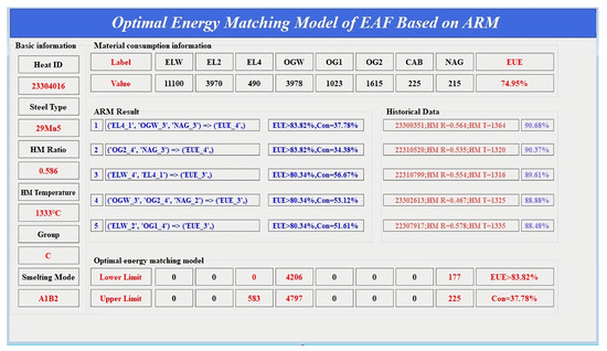 According to the results of the ARM, the model interface of the optimal energy matching mode for EAF steelmaking is established. The interface of the EAF optimal energy matching model based on the ARM is shown in Figure 9. The interface consists of basic smelting information, material consumption information, the association rules mining results, the optimal energy matching mode, and historical data statistics.