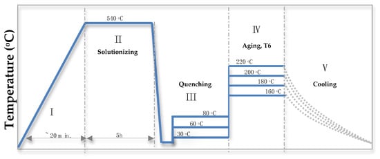 Representative temperature vs. time profile for the heating rate (I), solution treating (II), quenching (III), and three distinctive T6 heat treatments for the examined A356 alloy samples (IV). All adopted quenching are carried out in 120 s, and all aging treatments are performed for 180 min (3 h).