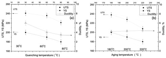 Relation among UTS, YS, and ductility in distinctive (a) quenching and (b) aging temperatures.