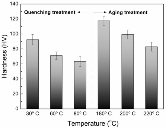 Quenching temperature and time have important roles in the achieved hardness. When selecting or adopting appropriate quenching parameters, the hardness can be tailored to reach certain desirable requirements. Based on the obtained results, a low quenching temperature induces a hardness increase. On the other hand, high temperature promotes a decreasing trend in hardness. At 30 °C, the high hardness obtained seems to be attributed to the formation and transformation of the strengthening phases. These phases act as obstacles to dislocation movement, impeding deformation and contributing to the increase in the hardness.