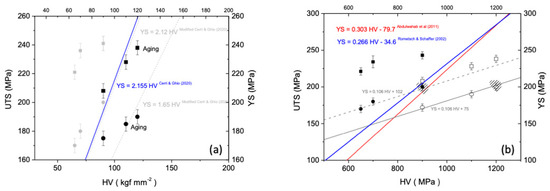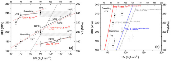 However, a linear regression model previously proposed by Cerri and Ghio [42] and Krishna et al. [43] is evaluated in Figure 5b. Krishna et al. [43] have proposed linear equations, i.e., UTS = 3.865 HV and YS = 1.97 HV, which overestimate the experimental results obtained for the samples aged in the three different aging temperatures. On the other hand, when only the quenched samples are considered (closed point in Figure 5b), the experimental results are within the range prescribed by the linear equations proposed, i.e., UTS = 3.865 HV and YS = 1.97 HV.