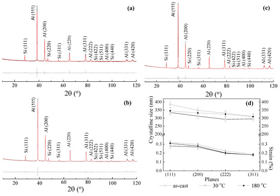 XRD patterns of the A356 alloy samples in condition: (a) as-cast, (b) water-quenched at 30 °C only, (c) artificially aged (T6) at 180 °C for 3 h; and (d) the calculated crystallite size and remaining strain determined by using Rietveld data (gray lines).
