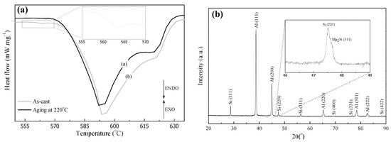 (a) Experimental DSC curves obtained by using 10 °C/min of the A356 alloy samples: (a) quenched at 30 °C and artificially aged at 220 °C and (b) the as-cast condition; (b) A typical XRD pattern corresponding with the as-cast A356 alloy sample, evidencing (inset) remaining Mg2Si particles.