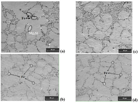 Also, from the metallurgical point of view, depending on the Si and Mg contents, the Mg-containing phases during solidification are the Mg2Si and π-Al8Mg3FeSi phases, [10,21,24,38,39,40]. Additionally, Mg2Si particles tend to become dissolute and homogenized in a short period when heat treatment is carried out [38]. Based on the DSC results associated with the dislocation density and the microhardness and mechanical strength results, the as-cast sample is the sample exhibiting more remaining Mg2Si particles, as shown in Figure 9c. This is also clearly confirmed in DSC curves.