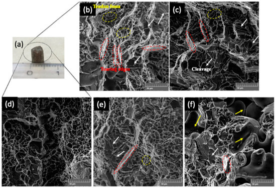 Figure 10b,c correspond with the examined fractures of the quenched A356 alloy samples. The typical cleavage planes (white arrows) coexisting with typical dimples with certain tendon fossa sites (yellow dashed circles) are characterized. These characteristics have been previously reported when heat treatments of the A356 alloys are applied [50]. Additionally, the tearing edges (red dashed circles) are clearly characterized, interposing the dimple regions. These tearing edges suggest typical brittle fracture behavior [51].
