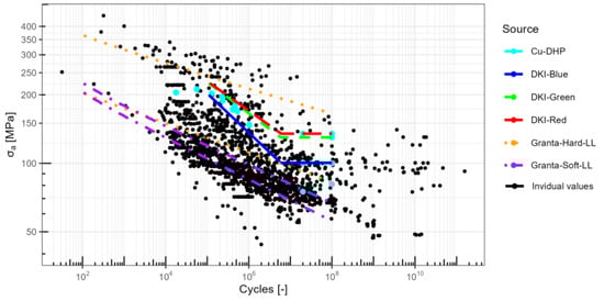 - Murphy, M.C. The Engineering Fatigue Properties of Wrought Copper. Fatigue Fract. Eng. Mater. Struct. 1981, 4, 199–234. [Google Scholar] [CrossRef]