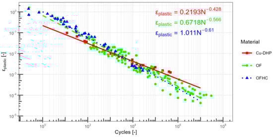 - Tanaka, T.; Sugioka, T.; Kobayashi, T.; Shohji, I.; Shimada, Y.; Watanabe, H.; Kamakoshi, Y. Low Cycle Fatigue Characteristics of Oxygen-Free Copper for Electric Power Equipment. Materials 2021, 14, 4237. [Google Scholar] [CrossRef] [PubMed]