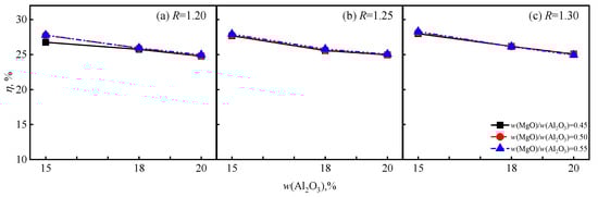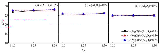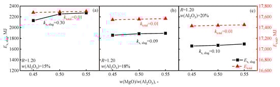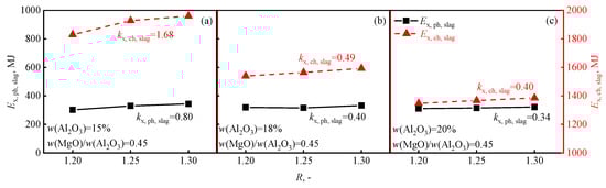 The effect of w(MgO)/w(Al2O3) on the η of the blast furnace is shown in Figure 5. As shown in Figure 5a, with the increase in w(MgO)/w(Al2O3), the η of the blast furnace shows a slight upward trend at w(Al2O3) =15%. However, Figure 5b,c show that there is no discernible change at w(Al2O3) = 18% or 20%. As shown in Figure 5, w(MgO)/w(Al2O3) is constant when w(Al2O3) = 15%, and as R increases from 1.20 to 1.25, η increases, and R increases from 1.25 to 1.30, while η shows no discernible change. When w(Al2O3) = 18% and 20%, with the increase in R, η shows no discernible change. The reason for this change was that when w(MgO)/w(Al2O3) decreases from 0.45 to 0.25, the viscosity of the slag increases from 0.32 Pa·s to 0.35 Pa·s under the condition of w(Al2O3) < 15%; when w(MgO)/w(Al2O3) decreases from 0.45 to 0.25, the viscosity of the slag increases from 0.32 Pa·s to 0.48 Pa·s under the condition of w(Al2O3) > 18% []. Therefore, the increase in w(MgO)/w(Al2O3) will lead to a decrease in the viscosity of the blast furnace slag, which is beneficial for the smooth operation of the blast furnace, reducing the energy consumption during the smelting process and indirectly improving the exergy efficiency of the blast furnace smelting process. In addition, with the increase in w(MgO)/w(Al2O3), the total exergy (Etotal) of the blast furnace underwent no discernible change, while the exergy of the slag (Ex, slag = Ex, ph, slag + Ex, ch, slag) gradually increased, as shown in Figure 6a. As shown in Figure 6b,c, when w(Al2O3) = 18% or 20%, Etotal and Ex, slag underwent no discernible change. The relative slope (kx, slag) of the change curve in Ex, slag was greater than the relative slope (ktotal) of the change curve in Etotal, and based on Equation (17), η increased. However, as shown in Figure 6b,c, when w(Al2O3) = 18% or 20%, there was no discernible change in η with an increase in w(MgO)/w(Al2O3) due to the low k.