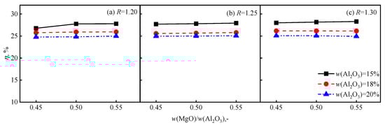 The range of changes in slag composition involved in this study was based on the on-site slag of a domestic steel enterprise in China and the possible range of changes. Among them, the range of w(MgO)/w(Al2O3) in slag is 0.45 to 0.55, the range of R in slag is 1.20 to 1.30, and the range of w(Al2O3) in slag is 15% to 20%.