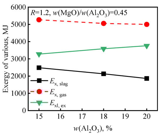 Figure 7 shows the effect of w(Al2O3) on the η of the blast furnace. As shown in Figure 7, the η of blast furnace slag decreased as w(Al2O3) increased from 15% to 20%. The reason was that when R = 1.15, w(MgO)/w(Al2O3) = 0.25, w(Al2O3) increased from 15% to 18%, and the slag viscosity increased from 0.37 to 0.45. When R = 1.15, w(MgO)/w(Al2O3) = 0.35, w(Al2O3) increased from 15% to 18%, and the slag viscosity increased from 0.37 to 0.42. When R = 1.15, w(MgO)/w(Al2O3) = 0.45, w(Al2O3) increased from 15% to 18%, and the slag viscosity increased from 0.26 to 0.36 []. Therefore, the increase in w(Al2O3) led to an increase in slag viscosity, hindered the smooth operation of the blast furnace, and the exergy of gas (Ex, gas = Ex, ph, D gas + Ex, ch, D gas + Ex, ph, w + Ex, ch, w) decreased, which led to an increase in the external exergy loss (Exl, ex) of the blast furnace. On the other hand, with the increase in the w(Al2O3) content of the blast furnace slag, the exergy of the slag (Ex, slag = Ex, ph, slag + Ex, ch, slag) decreased; according to Equation (17), the η of the blast furnace decreased. Thus, the exergy efficiency of the blast furnace decreased with increasing w(Al2O3). Ex, slag and Ex, gas decreased with increasing w(Al2O3), while Exl, ex increased with increasing w(Al2O3), as shown in Figure 8. This is because that with the increase in w(Al2O3), Exl, ex increases, resulting in an increase in the blast furnace exergy loss (Exl) and a decrease in the exergy efficiency (η). On the other hand, according to Equation (17), Ex, slag is positively correlated with η, so the decrease in Ex, slag will lead to a decrease in η. Therefore, as shown in Figure 7, with the increase in w(Al2O3), η decreases.