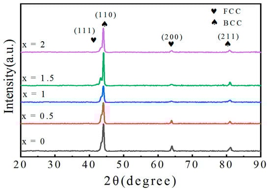 The XRD patterns of the FeCrMnxAlCu (x = 0, 0.5, 1.0, 1.5, and 2.0) HEA alloys are illustrated in Figure 1. The alloys exhibited a two-phase mixed organization comprising FCC and BCC structures. In particular, the (111) and (200) diffraction peaks corresponded to the FCC phase, while the (110) and (211) diffraction peaks were attributed to the BCC phase. In addition to these major characteristic peaks, no other diffraction signals of the precipitated phases were observed. With the increase in Mn content, the diffraction peak intensities of the BCC phase demonstrated a tendency to decrease and then increase. Furthermore, the diffraction peak intensities of the BCC phase were higher than those of the FCC phase in all specimens with different Mn contents.