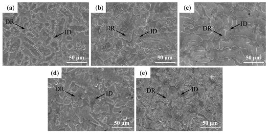 Figure 2 shows the scanning electron microscopy images of FeCrMnxAlCu HEAs; all samples exhibited dendritic crystal microstructures, and two regions of dendrites (DR) and inter-dendrites (ID) can be seen in the figure. With the increase in Mn content, the thickness and length of the dendrites changed. Figure 2a–c demonstrate that with the increase in Mn content, the dendrites became thicker and increased in length, which may be attributed to the addition of Mn causing a change in the crystal growth rate. This, in turn, affected the morphology of the dendrites. Figure 2d–e show that the additional increase in Mn content resulted in relatively unstable changes in the thickness and length of the dendrites. This may indicate that the addition of Mn has a considerable effect on the morphology of dendritic crystals within a certain range; however, when the Mn content exceeds a certain threshold, the effect may become complex or unstable.