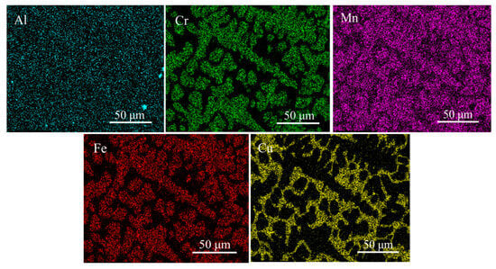 The EDS map of the FeCrMn1.5AlCu HEAs is demonstrated in Figure 3. Comparison with the compositional analysis of the FeCrMnxAlCu HEAs in Table 2 confirms that the chemical compositions of samples were determined using standard compositions, and these data provide clear information about the distribution characteristics of the elements in these alloys. In the FeCrMnxAlCu HEAs, Fe, Cr, and Mn tended to concentrate within the dendrites during solidification, whereas Cu favored the inter-dendritic region, and Al was more uniformly distributed in the dendritic and inter-dendritic regions. Table 2 shows that increasing the Mn element content promoted the bias of Fe and Cr elements within the dendrites and the bias of Cu elements between the dendrites.
