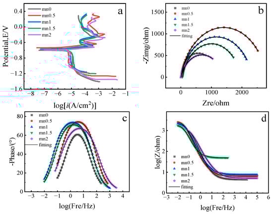 Nevertheless, Mn still plays an important role in mechanical properties, such as transformation-induced plasticity (TRIP) and/or twinning-induced plasticity (TWIP) effects [,]. Therefore, it is necessary to carry out corrosion experiments of Mn on high-entropy alloys to further explore the deep mechanism of the influence of Mn and various alloying elements on the corrosion properties. In this study, we demonstrate that elemental Mn has a considerable influence on the stability of the phase structure, mechanical properties, and corrosion resistance of alloys owing to its ability to exist in a variety of oxidation states and exhibit considerable chemical reactivity [,]. Therefore, Mn is considered an important element in the compositional design of HEAs. Although HEAs have demonstrated excellent performance in many applications, their corrosion resistance to NaOH solutions, especially the effect of the content of the trace element Mn on this performance, has not been completely investigated and understood. Therefore, this study aimed to make a detailed investigation of the effect of Mn content on the corrosion resistance of FeCrMnxAlCu HEAs in NaOH solutions.